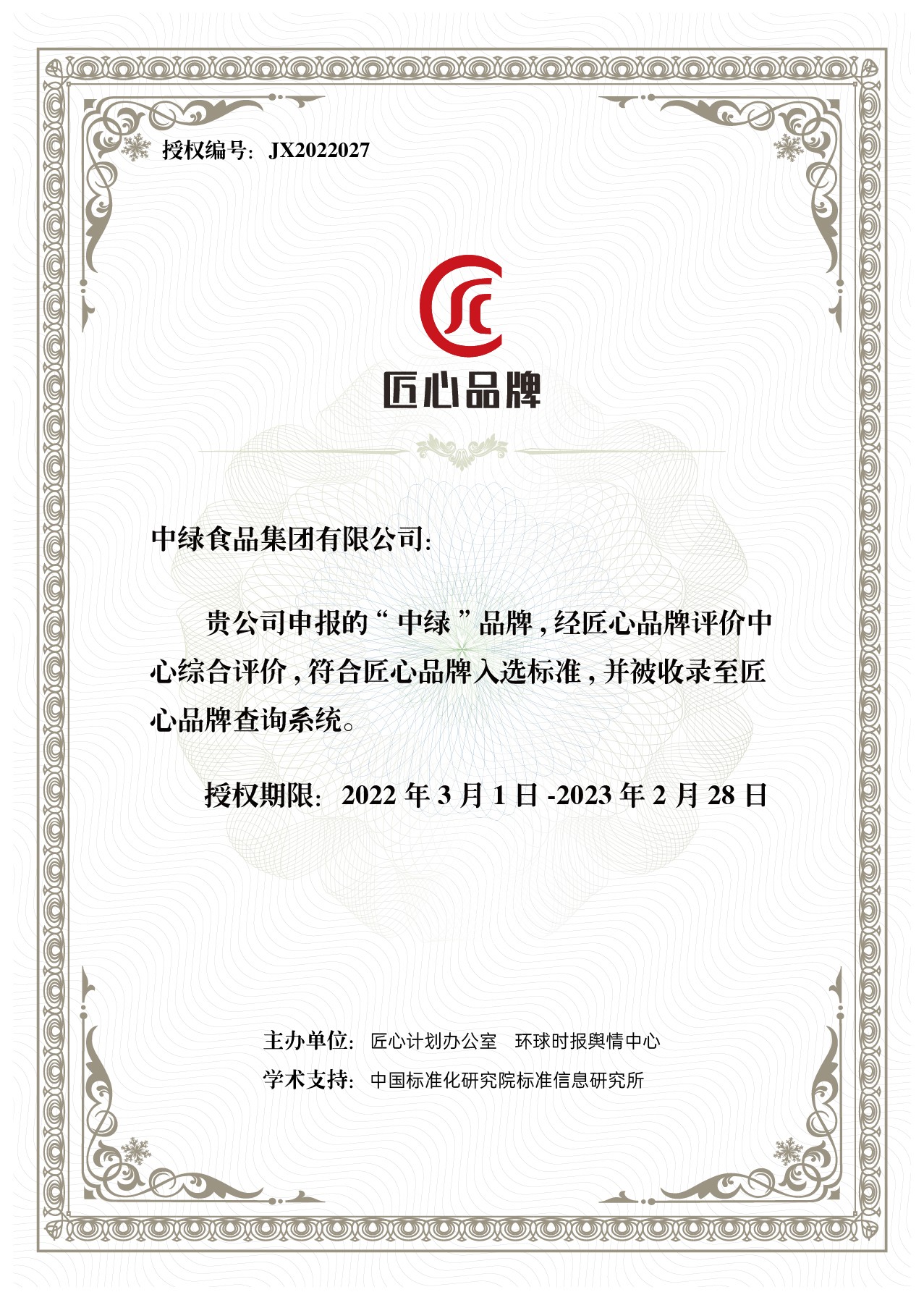 近日,由匠心计划办公室、环球时报舆情中心、中国标准化研究院标准信息研究所联合主办的2021匠心品牌评价工作圆满完成并发布评选结果。经过各项指标的层层考核,中绿食品集团再度入选2021匠心品牌,并被收录至匠心品牌查询系统。同期入选的品牌还有华为、海尔、小米、比亚迪、三一重工等众多国内知名品牌。